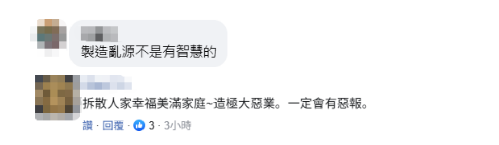 对此,有岛内网民在台媒评论区留言批评民进党当局,“制造乱源不是有智慧的”“拆散人家幸福美满家庭,造极大恶业,一定会有恶报”。